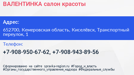 ВАЛЕНТИНКА, салон красоты по адресу 652700, Кемеровская область, Киселёвск, Транспортный переулок, 1 в дальнейшем Организация, размещена в следующих категориях: