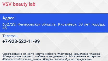 VSV beauty lab по адресу 652723, Кемеровская область, Киселёвск, 50 лет города, 45 в дальнейшем Организация, размещена в следующих категориях: