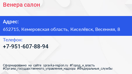 Венера, салон по адресу 652715, Кемеровская область, Киселёвск, Весенняя, 8 в дальнейшем Организация, размещена в следующих категориях: