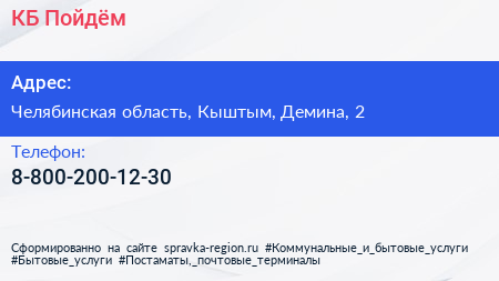 КБ Пойдём! по адресу Челябинская область, Кыштым, Демина, 2 в дальнейшем Организация, размещена в следующих категориях:
