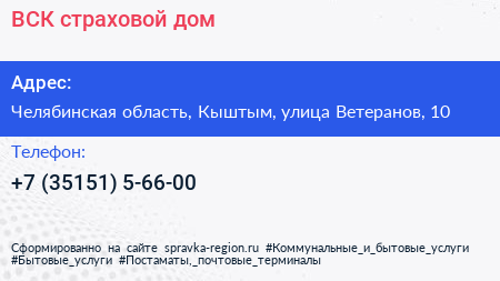 ВСК, страховой дом по адресу Челябинская область, Кыштым, улица Ветеранов, 10 в дальнейшем Организация, размещена в следующих категориях: