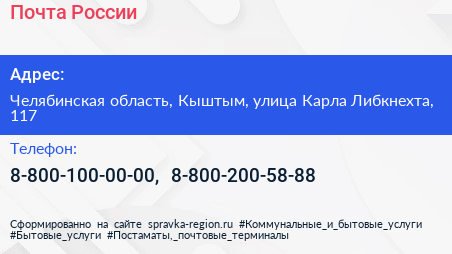 Почта России по адресу Челябинская область, Кыштым, улица Карла Либкнехта, 117 в дальнейшем Организация, размещена в следующих категориях: