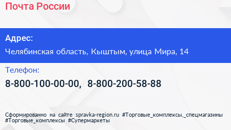 Почта России по адресу Челябинская область, Кыштым, улица Мира, 14 в дальнейшем Организация, размещена в следующих категориях: