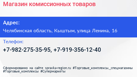 Магазин комиссионных товаров по адресу Челябинская область, Кыштым, улица Ленина, 16 в дальнейшем Организация, размещена в следующих категориях: