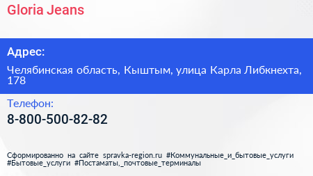 Gloria Jeans по адресу Челябинская область, Кыштым, улица Карла Либкнехта, 178 в дальнейшем Организация, размещена в следующих категориях: