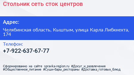 Стольник, сеть сток-центров по адресу Челябинская область, Кыштым, улица Карла Либкнехта, 174 в дальнейшем Организация, размещена в следующих категориях: