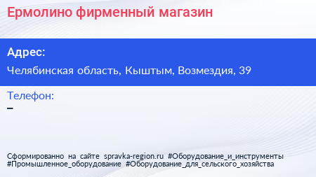 Ермолино, фирменный магазин по адресу Челябинская область, Кыштым, Возмездия, 39 в дальнейшем Организация, размещена в следующих категориях: