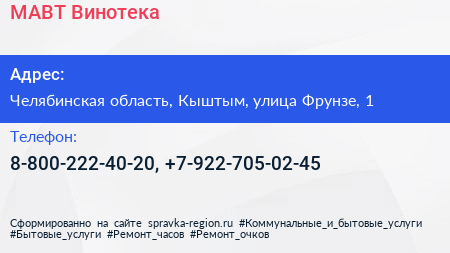 МАВТ-Винотека по адресу Челябинская область, Кыштым, улица Фрунзе, 1 в дальнейшем Организация, размещена в следующих категориях: