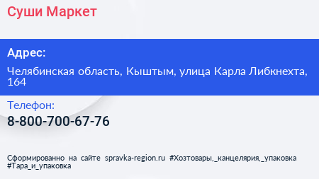 Суши-Маркет по адресу Челябинская область, Кыштым, улица Карла Либкнехта, 164 в дальнейшем Организация, размещена в следующих категориях: