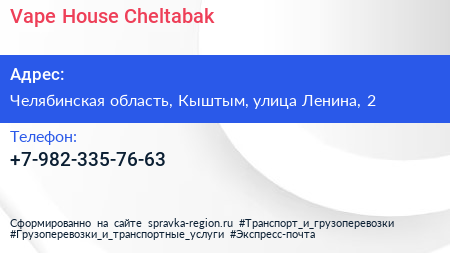 Vape House Cheltabak по адресу Челябинская область, Кыштым, улица Ленина, 2 в дальнейшем Организация, размещена в следующих категориях: