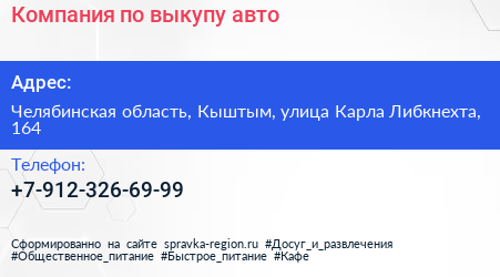 Компания по выкупу авто по адресу Челябинская область, Кыштым, улица Карла Либкнехта, 164 в дальнейшем Организация, размещена в следующих категориях: