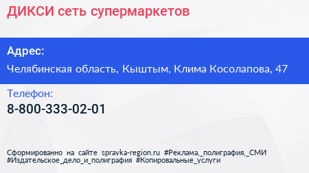 ДИКСИ, сеть супермаркетов по адресу Челябинская область, Кыштым, Клима Косолапова, 47 в дальнейшем Организация, размещена в следующих категориях: