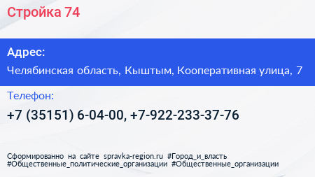 Стройка 74 по адресу Челябинская область, Кыштым, Кооперативная улица, 7 в дальнейшем Организация, размещена в следующих категориях: