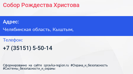 Собор Рождества Христова по адресу Челябинская область, Кыштым, в дальнейшем Организация, размещена в следующих категориях: