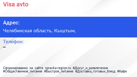 Visa-avto по адресу Челябинская область, Кыштым, в дальнейшем Организация, размещена в следующих категориях: