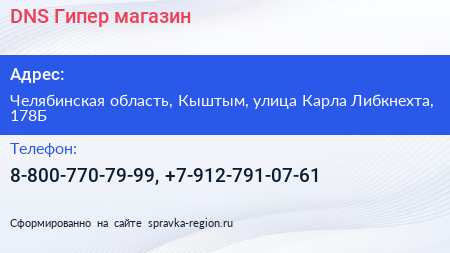 DNS Гипер, магазин по адресу Челябинская область, Кыштым, улица Карла Либкнехта, 178Б в дальнейшем Организация, размещена в следующих категориях: