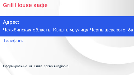 Grill House, кафе по адресу Челябинская область, Кыштым, улица Чернышевского, 6а в дальнейшем Организация, размещена в следующих категориях: