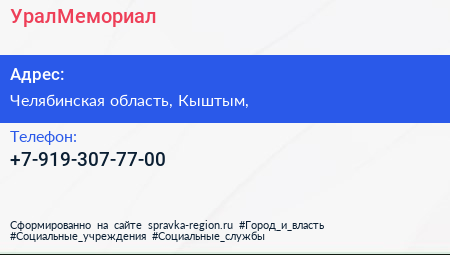 УралМемориал по адресу Челябинская область, Кыштым, в дальнейшем Организация, размещена в следующих категориях: