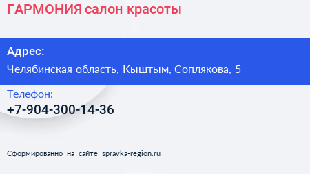 ГАРМОНИЯ, салон красоты по адресу Челябинская область, Кыштым, Соплякова, 5 в дальнейшем Организация, размещена в следующих категориях: