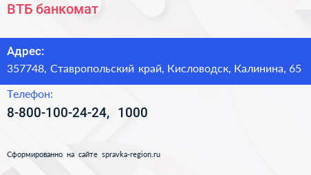 ВТБ, банкомат по адресу 357748, Ставропольский край, Кисловодск, Калинина, 65 в дальнейшем Организация, размещена в следующих категориях:
