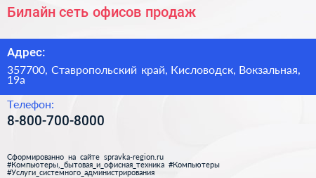 Билайн, сеть офисов продаж по адресу 357700, Ставропольский край, Кисловодск, Вокзальная, 19а в дальнейшем Организация, размещена в следующих категориях: