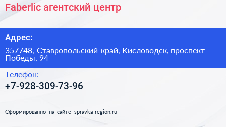 Faberlic, агентский центр по адресу 357748, Ставропольский край, Кисловодск, проспект Победы, 94 в дальнейшем Организация, размещена в следующих категориях: