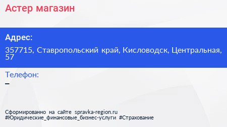 Астер, магазин по адресу 357715, Ставропольский край, Кисловодск, Центральная, 57 в дальнейшем Организация, размещена в следующих категориях: