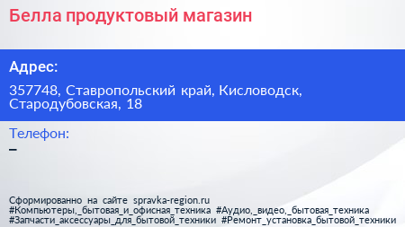 Белла, продуктовый магазин по адресу 357748, Ставропольский край, Кисловодск, Стародубовская, 18 в дальнейшем Организация, размещена в следующих категориях: