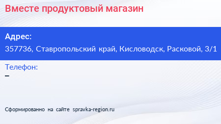 Вместе, продуктовый магазин по адресу 357736, Ставропольский край, Кисловодск, Расковой, 3/1 в дальнейшем Организация, размещена в следующих категориях:
