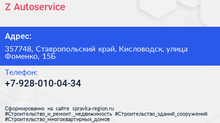 Z Autoservice по адресу 357748, Ставропольский край, Кисловодск, улица Фоменко, 15Б в дальнейшем Организация, размещена в следующих категориях: