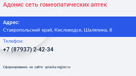 Адонис, сеть гомеопатических аптек по адресу Ставропольский край, Кисловодск, Шаляпина, 8 в дальнейшем Организация, размещена в следующих категориях: