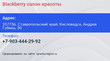 Blackberry, салон красоты по адресу 357736, Ставропольский край, Кисловодск, Андрея Губина, 30 в дальнейшем Организация, размещена в следующих категориях:
