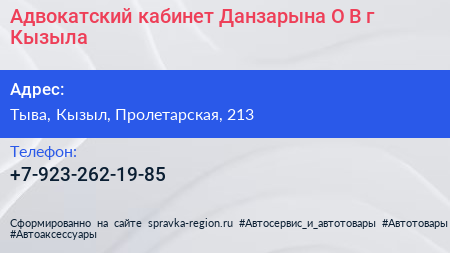 Адвокатский кабинет Данзарына О.В., г. Кызыла по адресу Тыва, Кызыл, Пролетарская, 213 в дальнейшем Организация, размещена в следующих категориях: