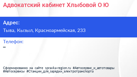 Адвокатский кабинет Хлыбовой О.Ю. по адресу Тыва, Кызыл, Красноармейская, 233 в дальнейшем Организация, размещена в следующих категориях: