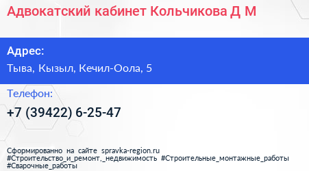 Адвокатский кабинет Кольчикова Д.М. по адресу Тыва, Кызыл, Кечил-Оола, 5 в дальнейшем Организация, размещена в следующих категориях: