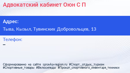 Адвокатский кабинет Оюн С.П. по адресу Тыва, Кызыл, Тувинских Добровольцев, 13 в дальнейшем Организация, размещена в следующих категориях: