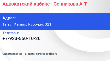 Адвокатский кабинет Сенникова А.Т. по адресу Тыва, Кызыл, Рабочая, 321 в дальнейшем Организация, размещена в следующих категориях: