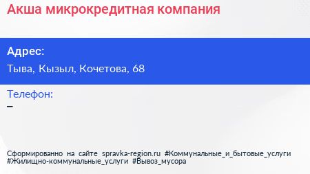 Акша, микрокредитная компания по адресу Тыва, Кызыл, Кочетова, 68 в дальнейшем Организация, размещена в следующих категориях: