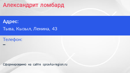 Александрит, ломбард по адресу Тыва, Кызыл, Ленина, 43 в дальнейшем Организация, размещена в следующих категориях:
