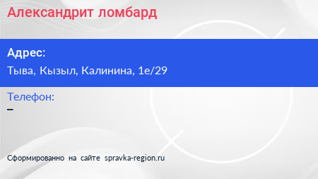 Александрит, ломбард по адресу Тыва, Кызыл, Калинина, 1е/29 в дальнейшем Организация, размещена в следующих категориях:
