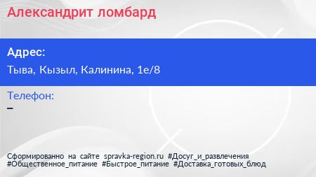 Александрит, ломбард по адресу Тыва, Кызыл, Калинина, 1е/8 в дальнейшем Организация, размещена в следующих категориях: