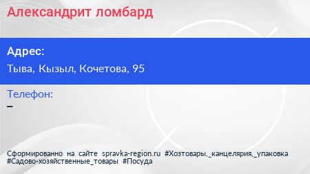 Александрит, ломбард по адресу Тыва, Кызыл, Кочетова, 95 в дальнейшем Организация, размещена в следующих категориях: