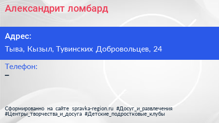 Александрит, ломбард по адресу Тыва, Кызыл, Тувинских Добровольцев, 24 в дальнейшем Организация, размещена в следующих категориях: