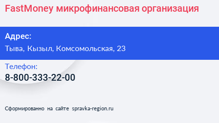 FastMoney, микрофинансовая организация по адресу Тыва, Кызыл, Комсомольская, 23 в дальнейшем Организация, размещена в следующих категориях: