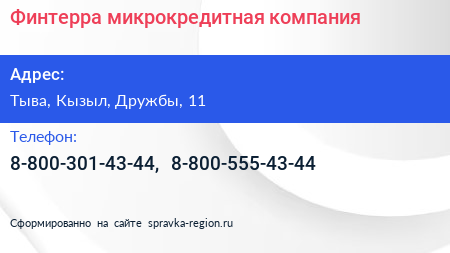 Финтерра, микрокредитная компания по адресу Тыва, Кызыл, Дружбы, 11 в дальнейшем Организация, размещена в следующих категориях: