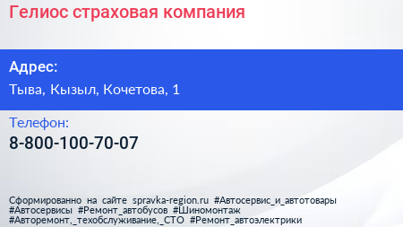 Гелиос, страховая компания по адресу Тыва, Кызыл, Кочетова, 1 в дальнейшем Организация, размещена в следующих категориях:
