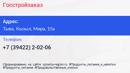 Госстройзаказ по адресу Тыва, Кызыл, Мира, 15а в дальнейшем Организация, размещена в следующих категориях: