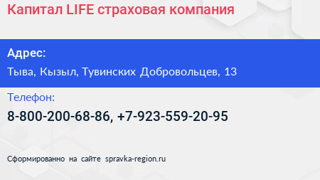 Капитал LIFE, страховая компания по адресу Тыва, Кызыл, Тувинских Добровольцев, 13 в дальнейшем Организация, размещена в следующих категориях: