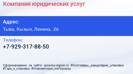 Компания юридических услуг по адресу Тыва, Кызыл, Ленина, 26 в дальнейшем Организация, размещена в следующих категориях: