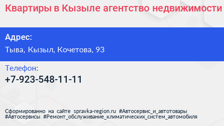 Квартиры в Кызыле, агентство недвижимости по адресу Тыва, Кызыл, Кочетова, 93 в дальнейшем Организация, размещена в следующих категориях: